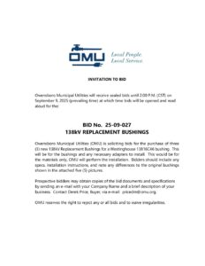 138kV REPLACEMENT BUSHINGS ID: 25-09-027 Posted: August 20, 2025 Deadline: September 9, 2025 Attachments Document Icon Document Date AD – 25-09-027 August 20, 2025